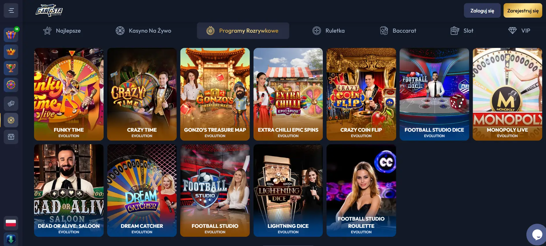 | Game Shows na żywo | Crazy Time, Monopoly Big Baller, Dream Catcher | Dla graczy, którzy lubią zabawne, dynamiczne i towarzyskie gry |