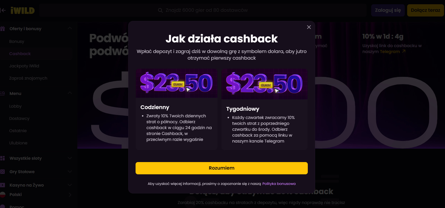 Przegrane są częścią gry w kasynie online, ale iWild oferuje dwa rodzaje cashbacku, które zmniejszają straty. Promocje są proste i nie wymagają skomplikowanych działań.