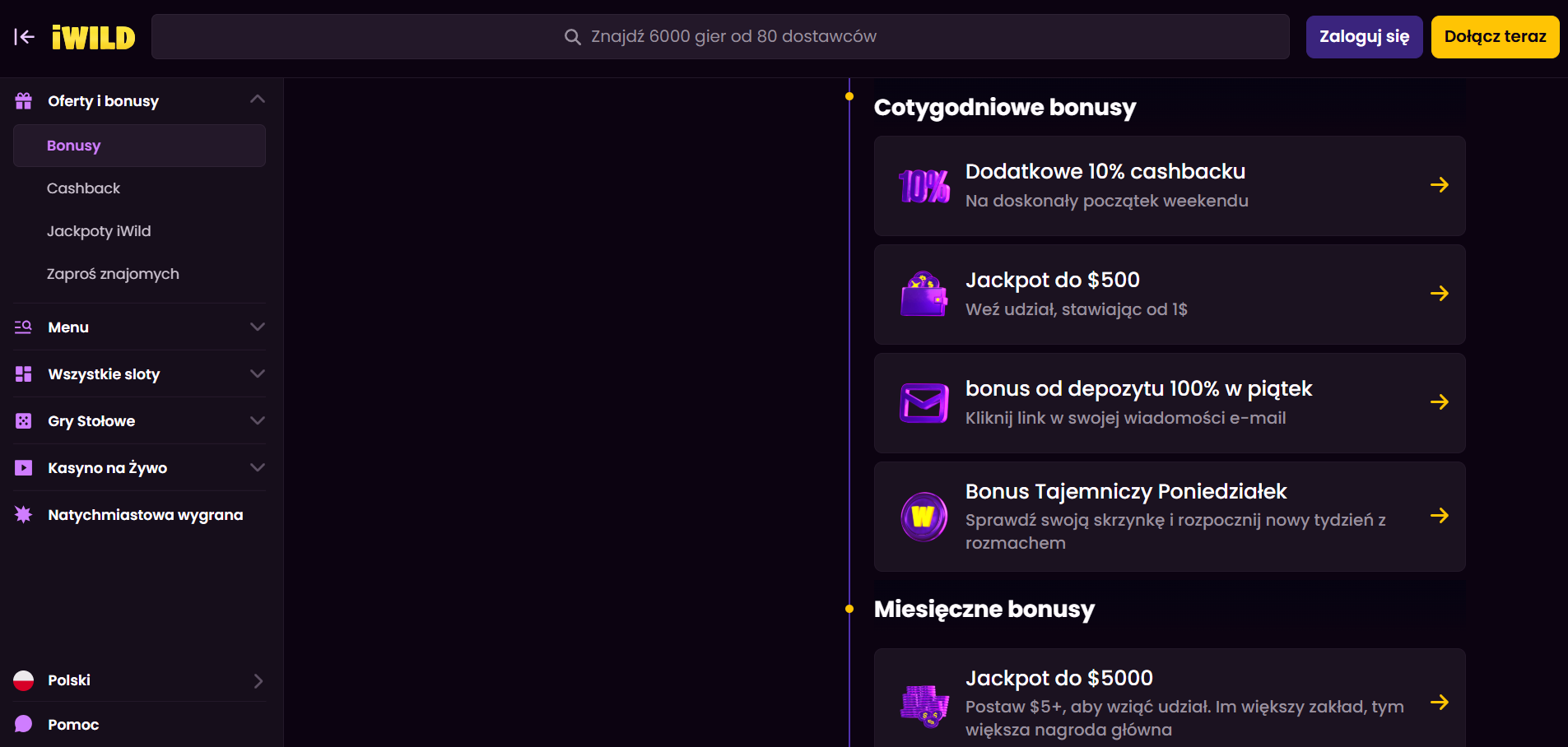 Oprócz standardowych bonusów kasynowych, iWild oferuje co tydzień dodatkowe bonusy, z których warto skorzystać:
