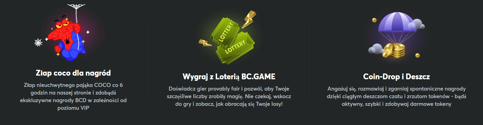 - Część bonusów przyznawana jest w BCD (waluta BC.Game).
