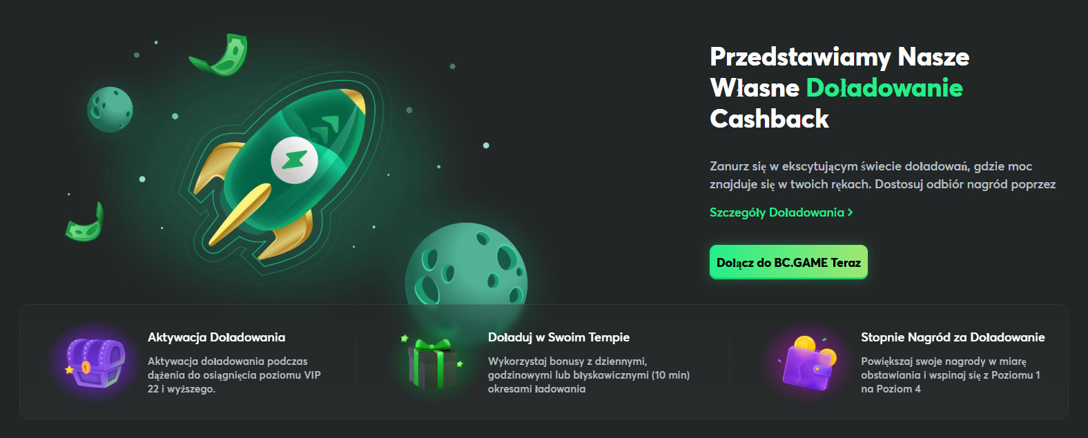 Jeśli chcesz zmaksymalizować swoją grę, funkcja doładowania cashback w kasynie online BC.Game jest dostępna dla graczy na poziomie VIP 22 i wyższym.