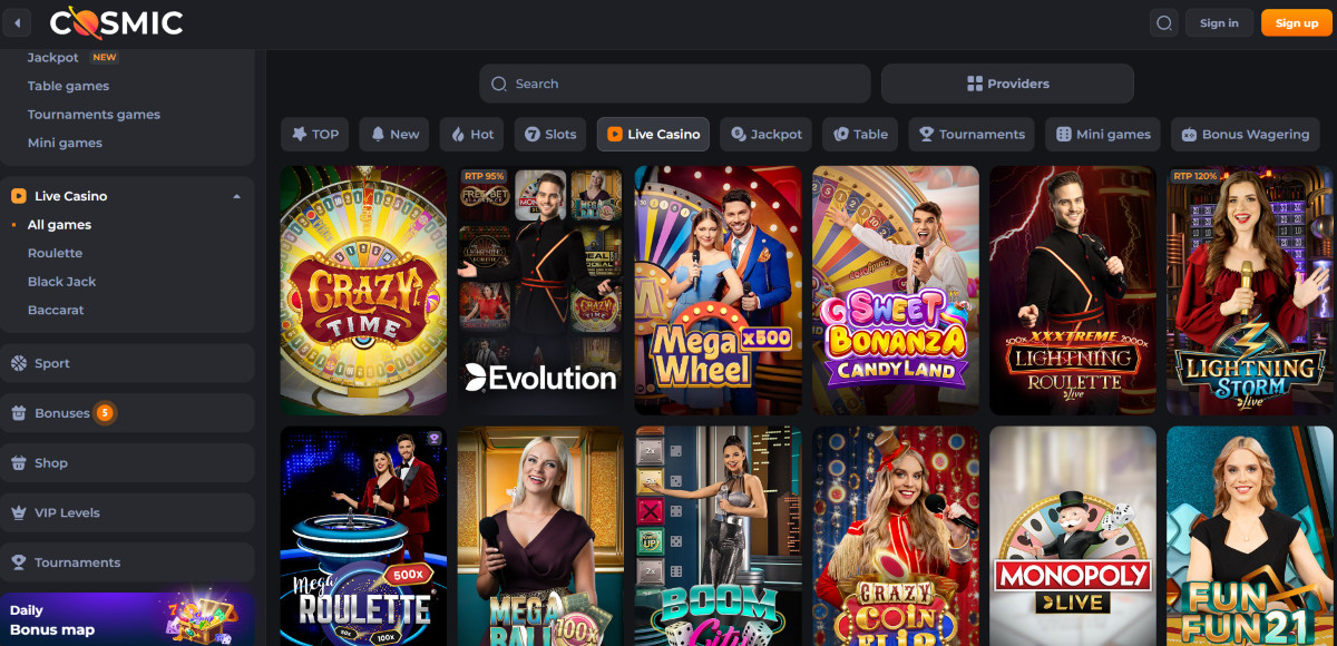 Warto zauważyć, że automaty w tym kasynie są wygodnie podzielone na kilka kategorii, takich jak Najnowsze, Najpopularniejsze, Gorące i Megaways. Oprócz automatów na CosmicSlot, znajdziesz także sekcję gier stołowych i gier kasynowych na żywo z Evolution Gaming.