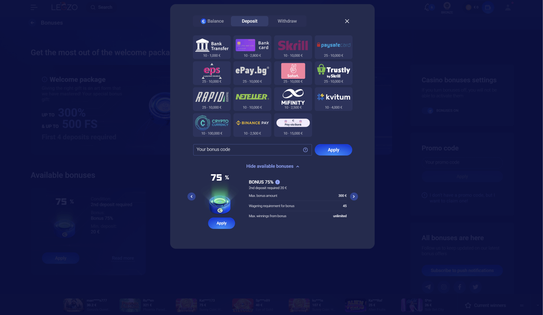 To kasyno oferuje różne bonusy, które mają przyjazne dla gracza warunki. Jedną z największych zalet Legzo jest to, że bonusy doładowujące nie podlegają maksymalnemu limitowi wygranych. Jeśli chodzi konkretnie o dostępne bonusy, oto niektóre z najważniejszych.