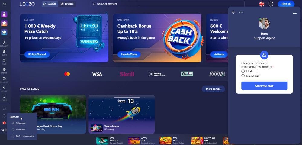 Centrum obsługi klienta w Legzo jest otwarte 24 godziny na dobę, 7 dni w tygodniu, więc niezależnie od pory dnia masz pytanie, zawsze możesz skontaktować się z kasynem, aby znaleźć rozwiązanie.