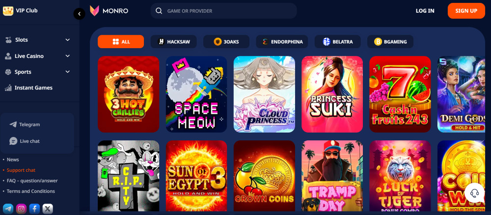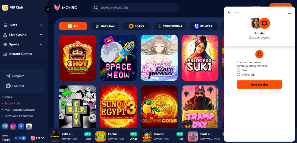 Oprócz automatów Monro oferuje również sekcję gier błyskawicznych, w której można znaleźć najpopularniejsze mini-gry, takie jak Aviator, Mines, Plinko itp. A jeśli chcesz poczuć ducha prawdziwego kasyna, możesz odwiedzić sekcję Live Casino, gdzie znajdziesz wysokiej jakości gry na żywo, takie jak blackjack, ruletka i bakarat.