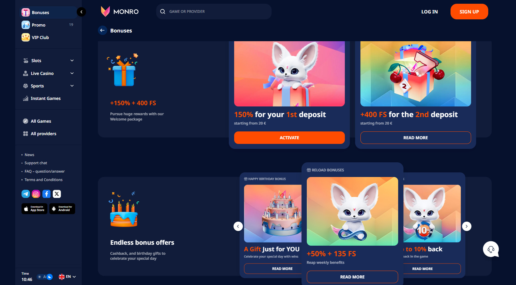 W Monro Online Casino nowi gracze mogą otrzymać 150% bonusu od pierwszego depozytu do 600 € i 400 darmowych spinów za drugi depozyt.