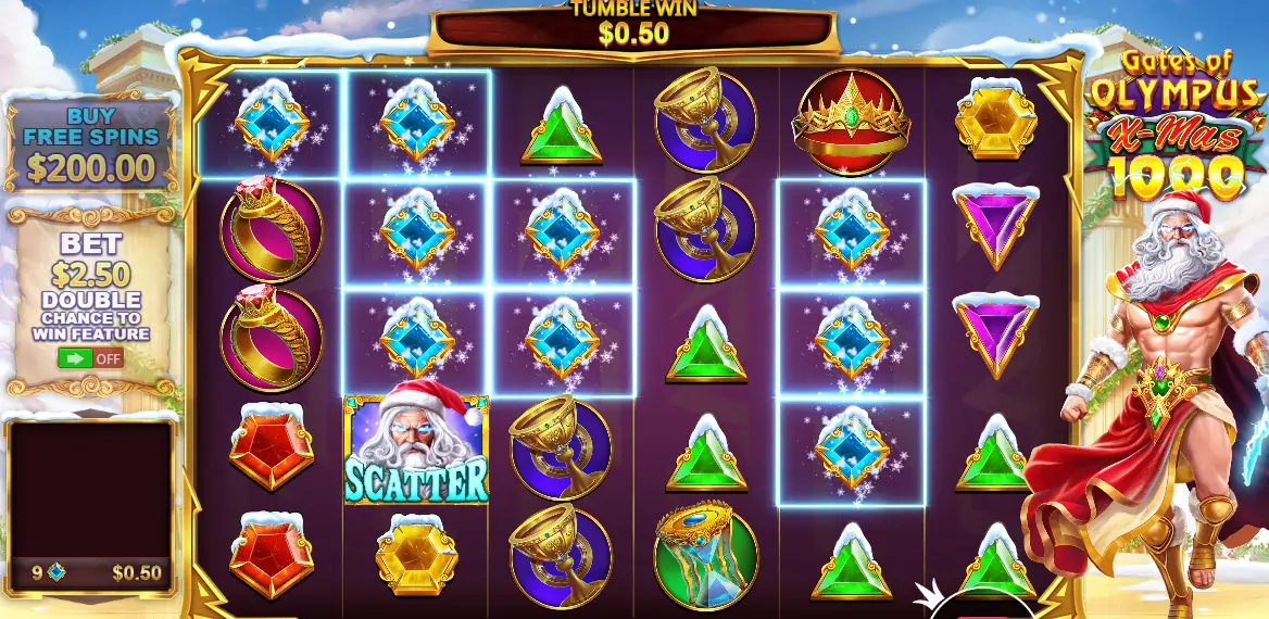 Od momentu premiery Gates of Olympus podbił serca fanów slotów na całym świecie, dlatego Pragmatic Play konsekwentnie rozwija serię o kolejne części. Jedną z nich jest Gates of Olympus X-Mas 1000, przygotowany specjalnie na świąteczny okres.