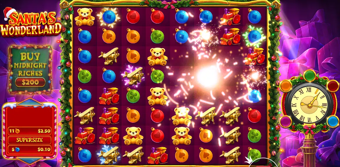 Ta funkcja działa praktycznie na całej planszy i na początku może wydawać się nieco skomplikowana, ale potrafi solidnie wynagrodzić gracza. Pojawiają się kolejne kaskadowe wygrane, mnożniki zwiększające wypłaty oraz specjalne kolorowe znaczniki z dodatkowymi efektami. Zegar przesuwa się naprzód, symbole wybuchają, Święty Mikołaj się śmieje, a saldo na koncie rośnie.