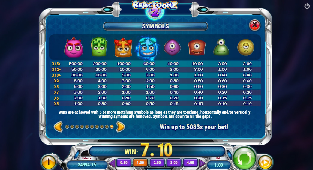 Jak można zauważyć, różowy symbol z dwoma oczami jest najbardziej wartościowy i jeśli uda ci się wygrać, gdy 15 lub więcej tych symboli połączy się – wygrasz 500x. Natomiast żółty symbol z jednym okiem ma najniższą wartość i nawet jeśli zbierzesz więcej niż 15 z nich, wygrasz tylko 3x stawki.