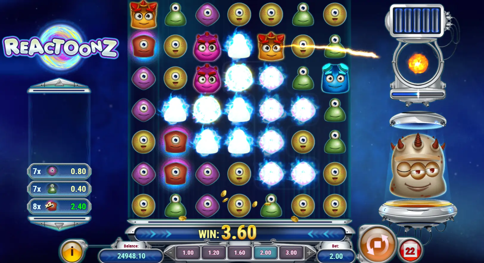 Mnożniki mogą zwielokrotnić wygrane, szczególnie w slotach o wysokiej zmienności, takich jak Reactoonz 2. W tego typu grach łączą się one z mechaniką kaskadową, gdzie zwycięskie symbole znikają, a każdy nowy trafiony układ zwiększa mnożnik.