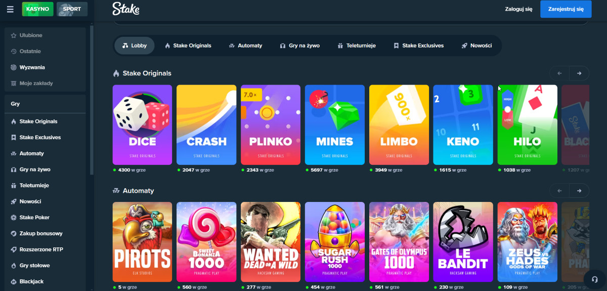 - znajdziesz także sekcje ” Stake Originals” i „Stake Exclusives”, które zawierają gry dostępne wyłącznie w tym kasynie;