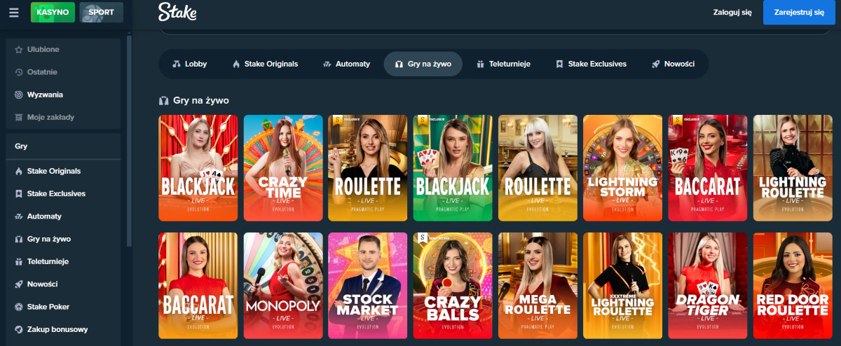 - oprócz slotów, kasyno to posiada również sekcję Stake Live Casino, w której znajdziesz gry ze studia Evolution Gaming.