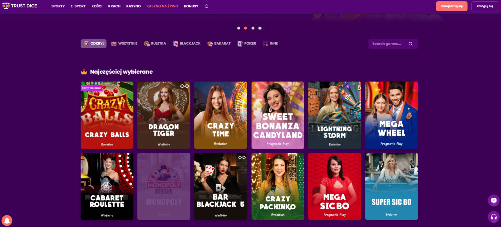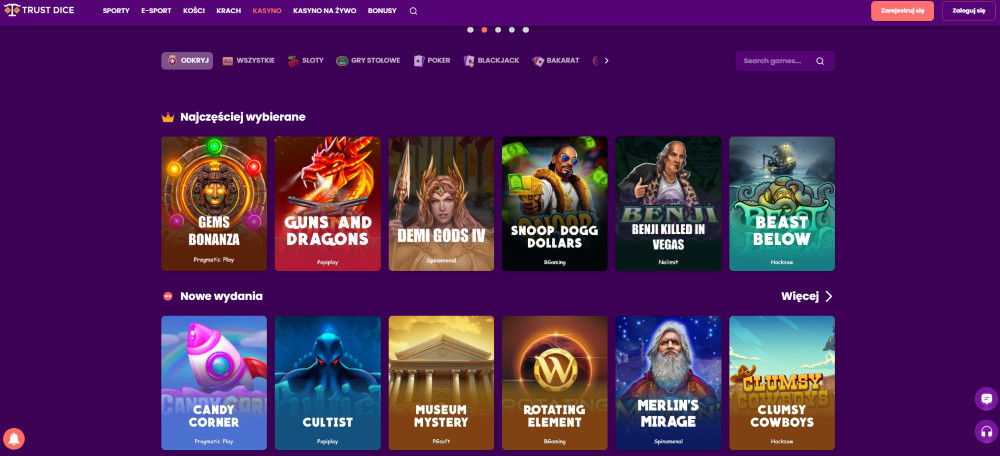 Automaty, blackjack, baccarat, ruletka, sic bo, poker, bingo oraz video poker to tylko niektóre z różnych gier kasynowych, które możesz tutaj znaleźć. Dodatkowo, TrustDice oferuje dostęp do swoich własnych gier crash i dice.