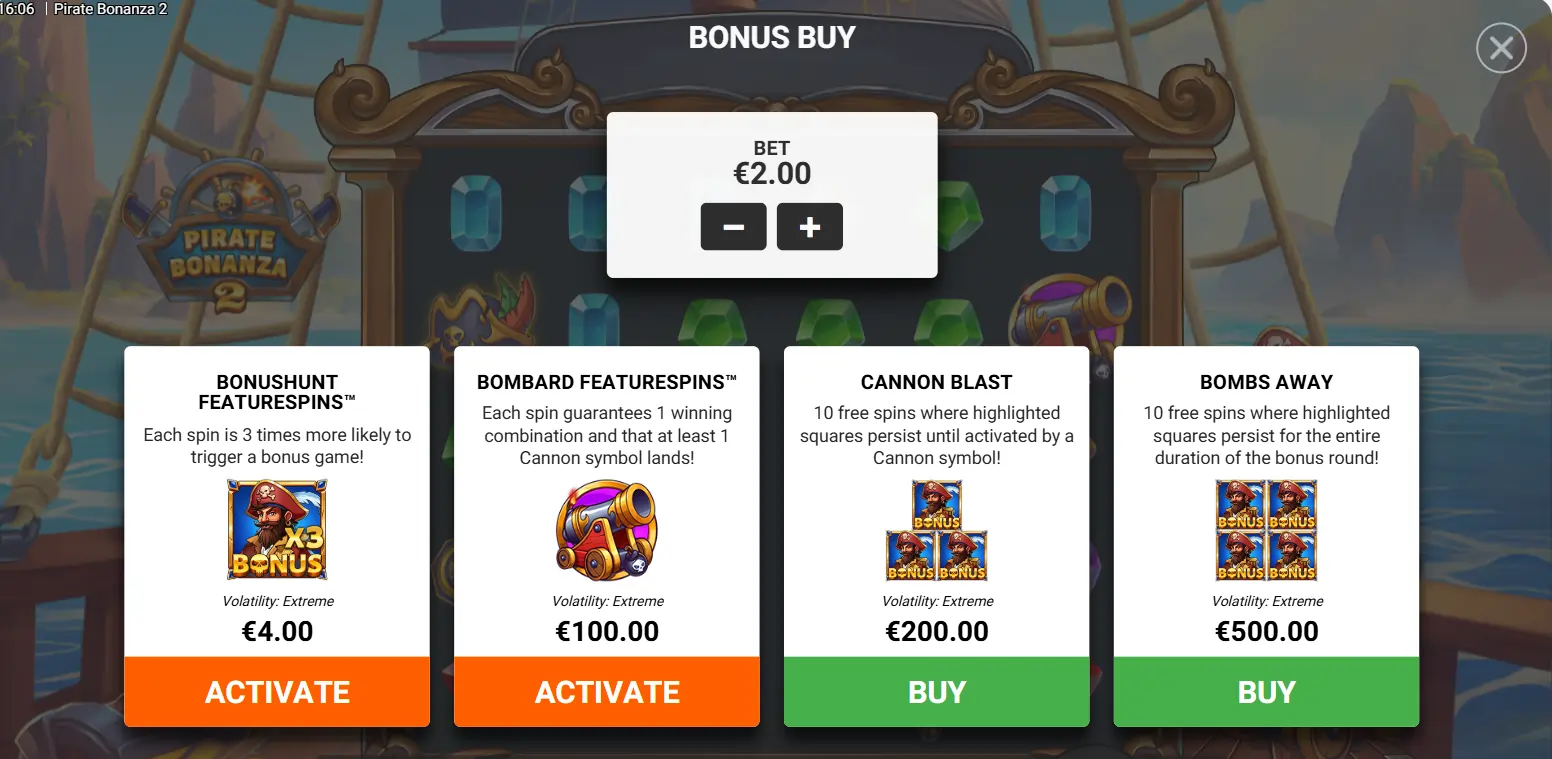 Dla graczy, którzy nie chcą czekać, Pirate Bonanza 2 oferuje opcje zakupu bonusów. Koszt zakupu zależy od wybranej rundy darmowych spinów. Każda opcja ma nieco inne wartości RTP, dając graczom szansę na natychmiastowe włączenie się do akcji. Choć może to kusić, najlepiej jest używać tej opcji ostrożnie, zwłaszcza w grze o wysokiej zmienności.