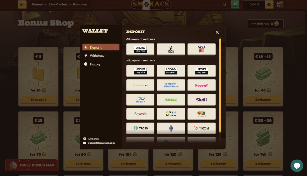 Oprócz automatów, kasyno to oferuje również różnorodne mini-gry, sekcję kasyna na żywo, gry stołowe, zdrapki itp. Jesteśmy pewni, że będziesz pod wrażeniem gier oferowanych na SmokAce i że zawsze będziesz w stanie znaleźć grę, którą lubisz.