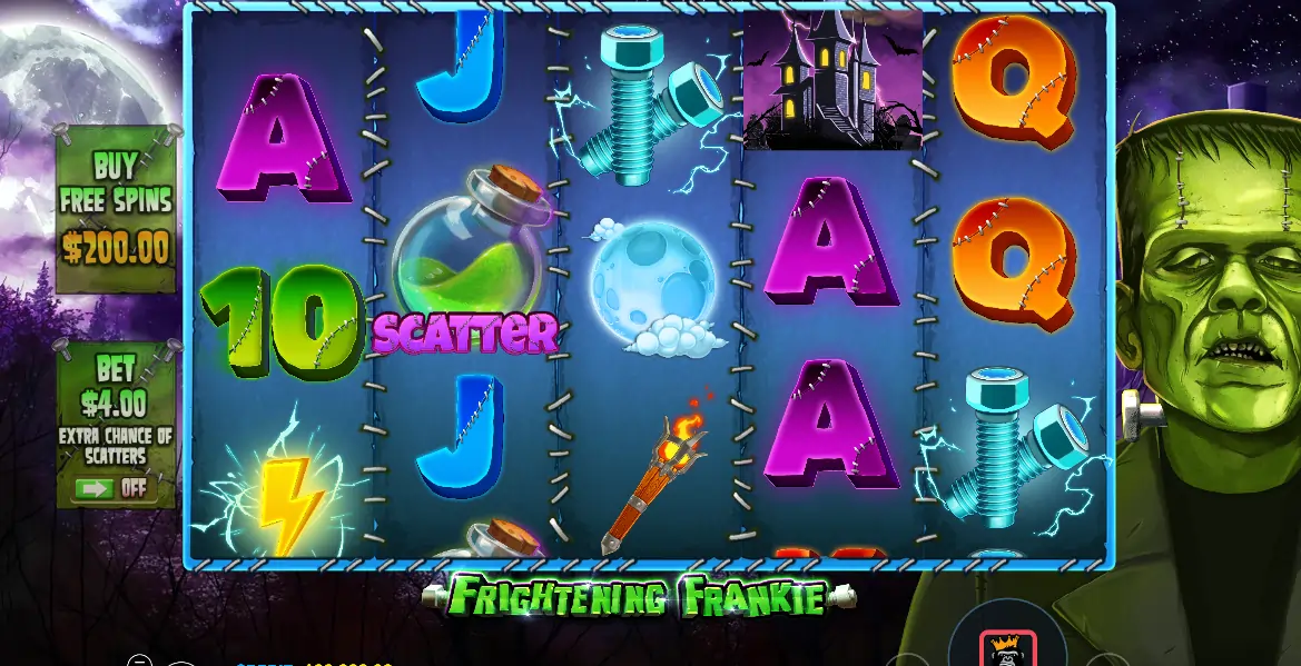 Zainspirowany klasyczną opowieścią o Frankensteinie, Frightening Frankie łączy gotycki klimat z dynamiczną rozgrywką. Ciemne tła, błyski elektryczności i napięta muzyka tworzą prawdziwy horrorowy nastrój, a funkcja Free Spins uruchamia się średnio co 57 rund.